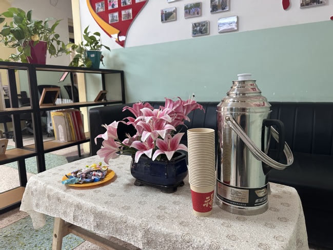 中心同步在公寓楼服务大厅设置服务点,提前备好热水和一次性纸杯,方便学生取用。社区工作人员根据学生流量及时补充热水和糖果,保障服务不断档。
